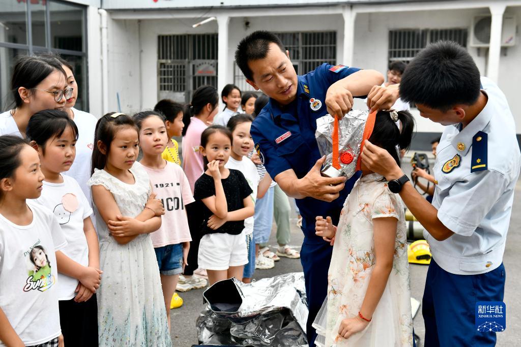 7月26日,在莒縣龍山鎮東樓村“小草學(xué)堂”,莒縣消防救援大隊的指戰員為孩子試戴防毒面罩并講授消防安全知識。