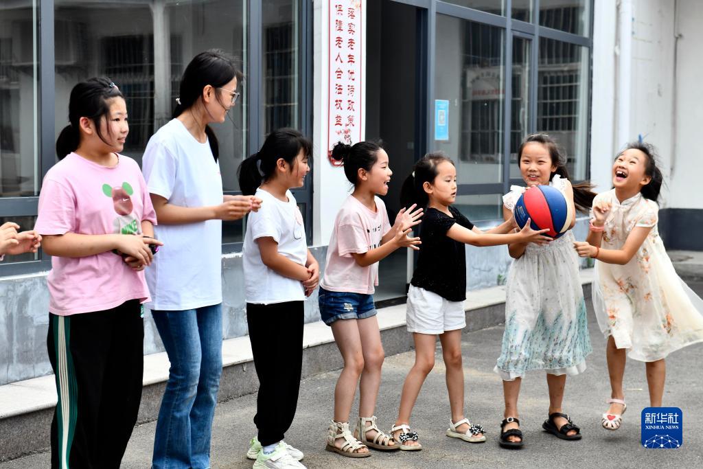 7月26日,在莒縣龍山鎮東樓村“小草學(xué)堂”,孩子們在哈爾濱理工大學(xué)志愿者的帶領(lǐng)下做游戲。