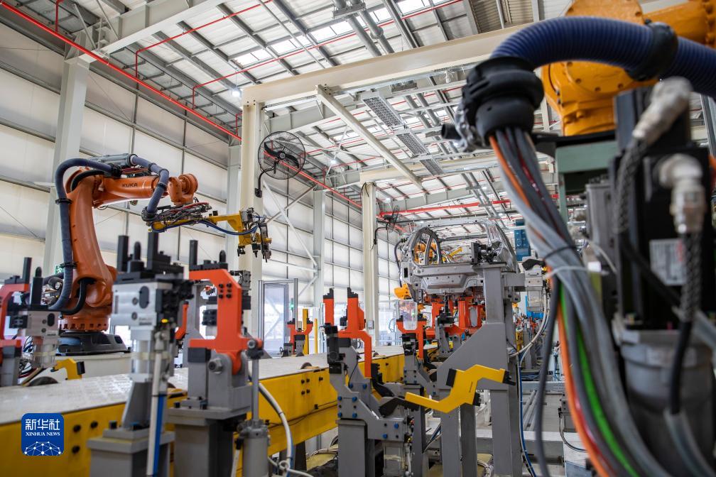 這是5月9日在南非東開(kāi)普省北汽南非工廠(chǎng)拍攝的焊裝車(chē)間生產(chǎn)線(xiàn)。