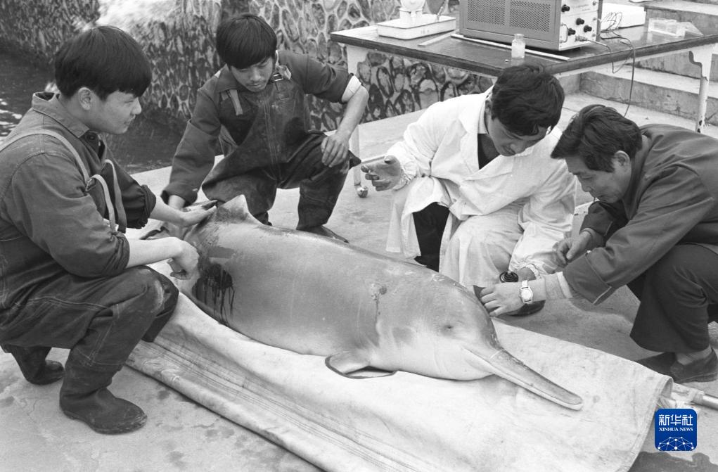中國科學(xué)院水生生物研究所白鱀豚研究組的科研人員為白鱀豚“淇淇”進(jìn)行檢查(20世紀80年代拍攝,資料照片)。