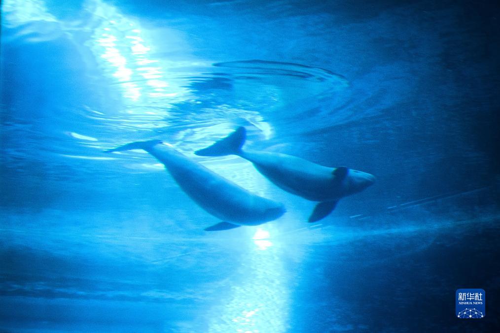 7月12日,兩頭長(cháng)江江豚在白鱀豚館水中游動(dòng)。