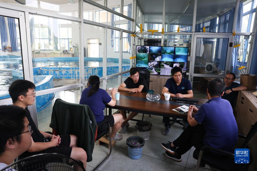 7月12日,中國科學(xué)院水生生物研究所白鱀豚館訓練員在討論長(cháng)江江豚喂養方案。