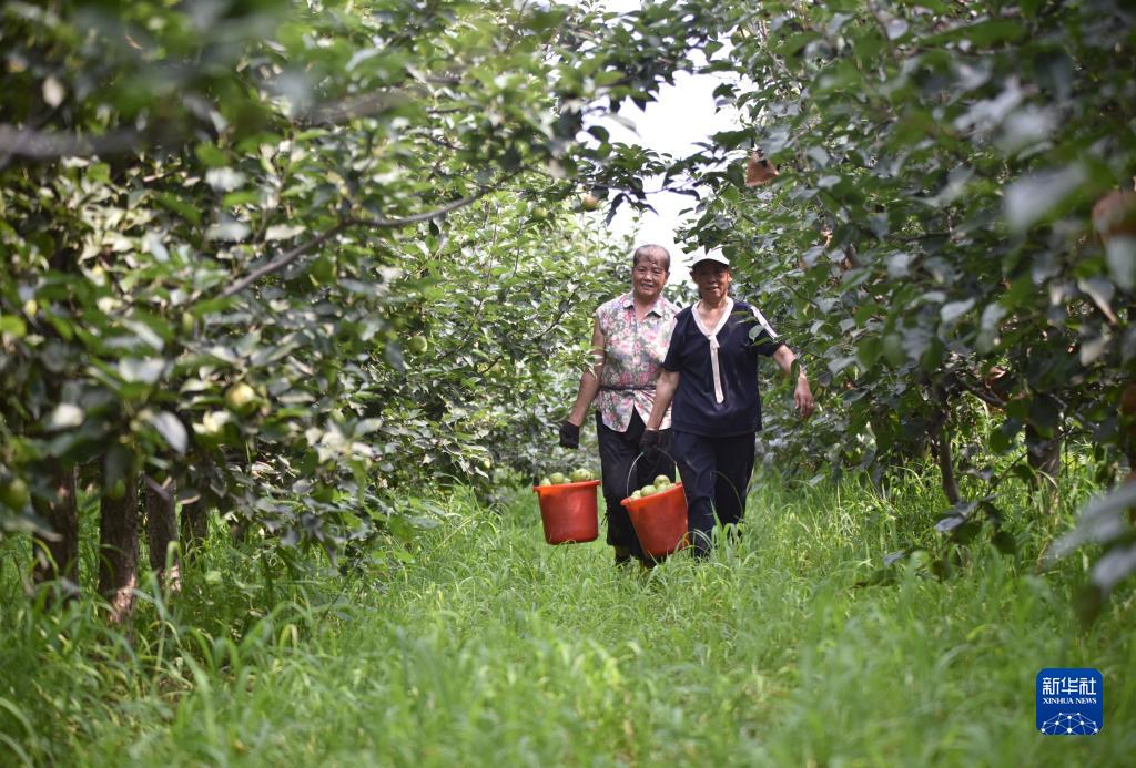 7月27日,河北省威縣張營(yíng)鄉前花疃村果農在梨園運送采摘的梨果。
