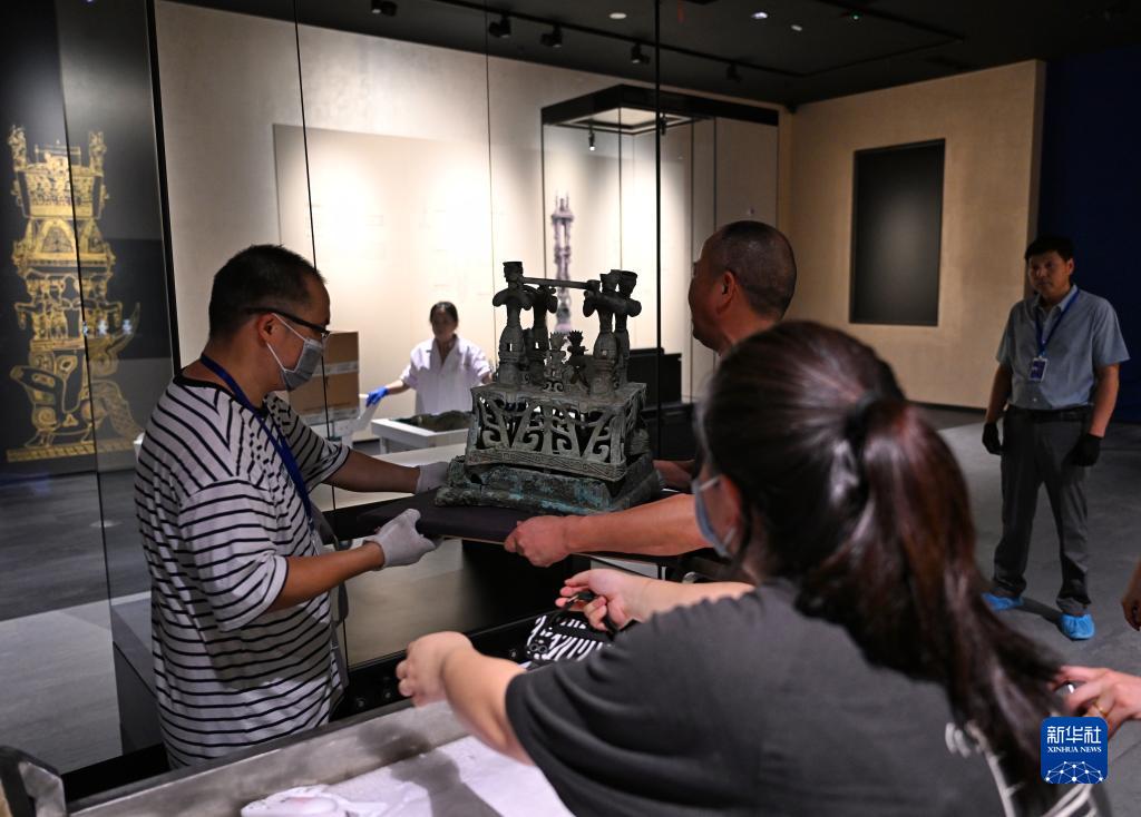 7月26日,工作人員在三星堆博物館新館內布展。