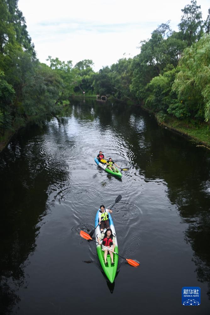 7月27日,游客在嘉興市南湖區新豐鎮竹林村的公園河道內體驗劃船游覽項目。
