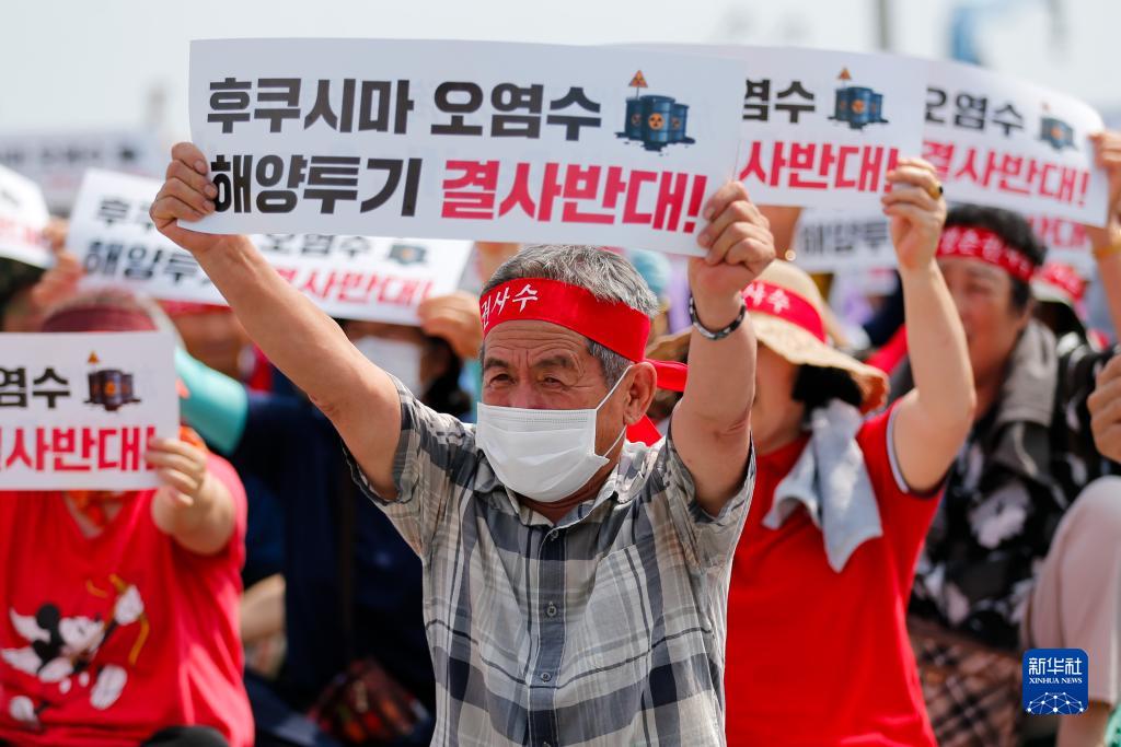 7月26日,在韓國全羅南道寶城郡沿海一帶,韓國漁民手持標語(yǔ)參加集會(huì )活動(dòng),抗議日本核污染水排海。