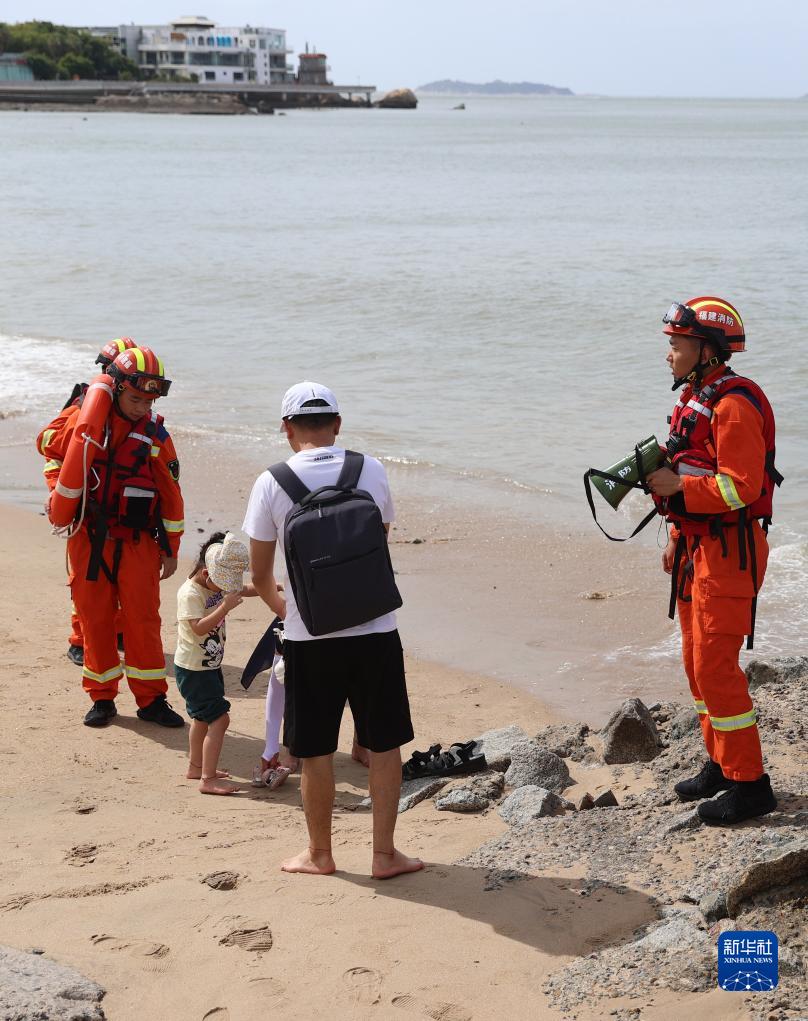7月27日,福建省廈門(mén)市思明區廈港消防救援站消防員在廈門(mén)環(huán)島路海邊對游客進(jìn)行勸離。