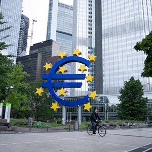 7月27日,一名男子騎車(chē)經(jīng)過(guò)德國法蘭克福的歐元標志。