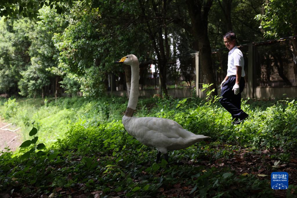 在位于江西省永修縣的江西鄱陽(yáng)湖國家級自然保護區吳城保護站,王小龍在觀(guān)察一只收治的天鵝(7月15日攝)。