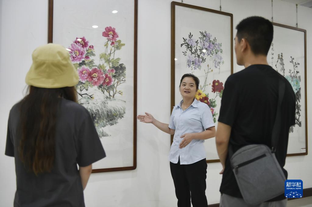 7月26日,工作人員在平樂(lè )社區的牡丹畫(huà)創(chuàng )意產(chǎn)業(yè)園區展廳內向來(lái)訪(fǎng)者介紹牡丹畫(huà)。