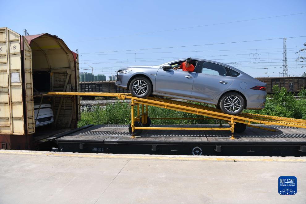 2023年5月9日,在位于合肥市長(cháng)豐縣的鐵路水家湖貨運站,工作人員裝運新能源汽車(chē)。