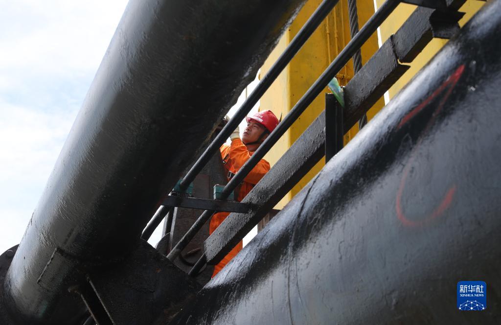 7月26日,一名水手在對完成起耙的“新海鳳”輪右舷耙吸管進(jìn)行例行安全檢查。