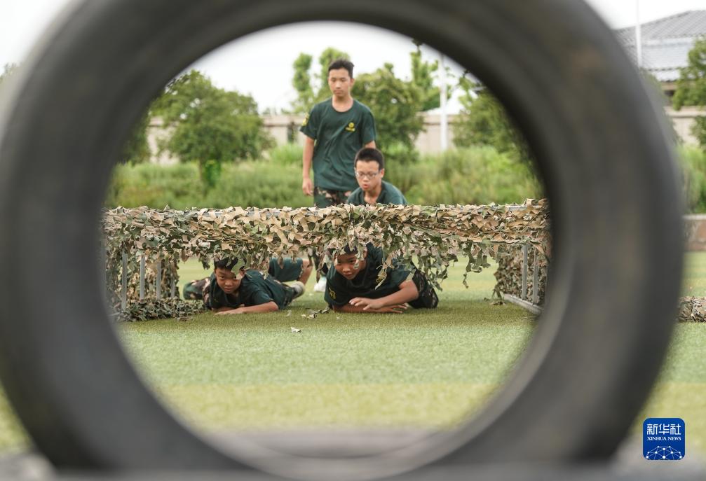參加軍事特訓營(yíng)的小朋友在進(jìn)行軍事拓展訓練(7月26日攝)。