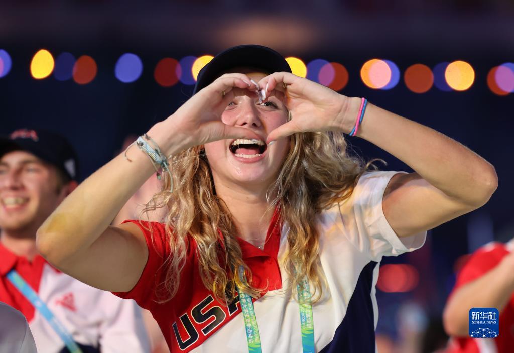 7月28日,美國大學(xué)生體育代表團在開(kāi)幕式上入場(chǎng)。
