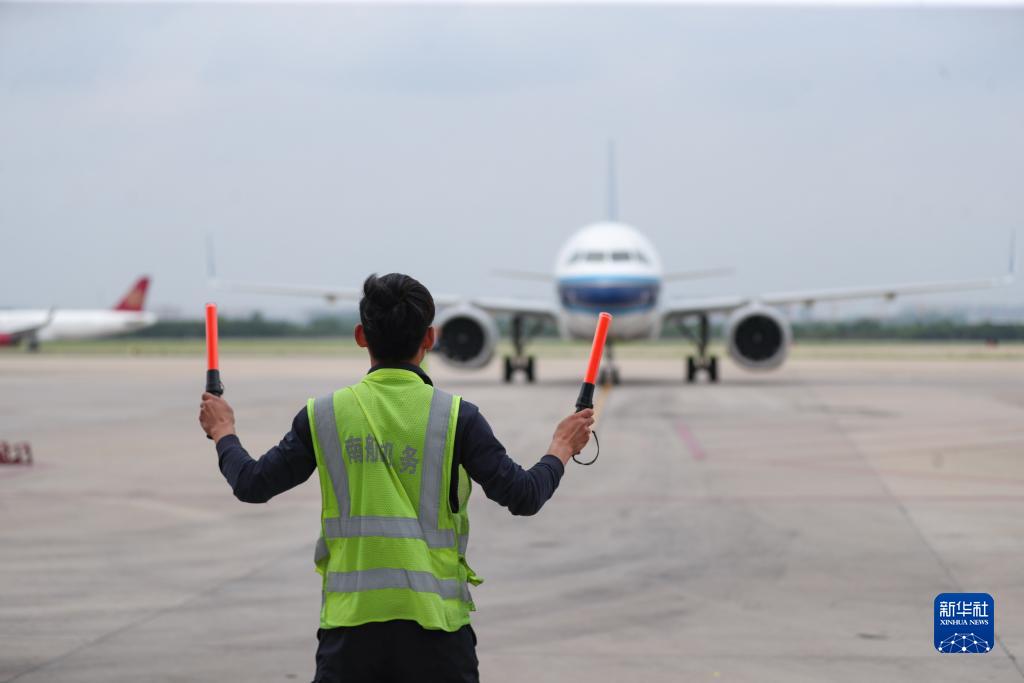 7月28日,南航工程技術(shù)分公司沈陽(yáng)基地的機務(wù)人員在引導飛機。