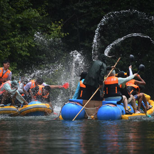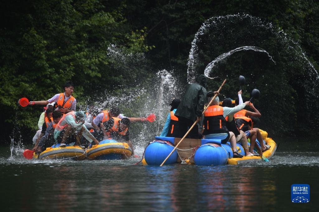 7月27日,游客在湖南省資興市東江湖景區體驗東江漂流。
