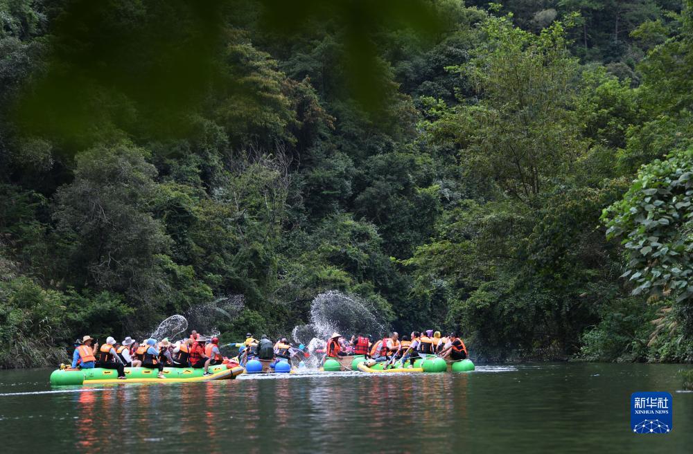 7月27日,游客在湖南省資興市東江湖景區體驗東江漂流。
