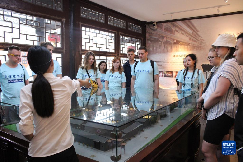參加夏令營(yíng)的來(lái)華學(xué)生在天津市西青區楊柳青鎮石家大院參觀(guān)(7月21日攝)。