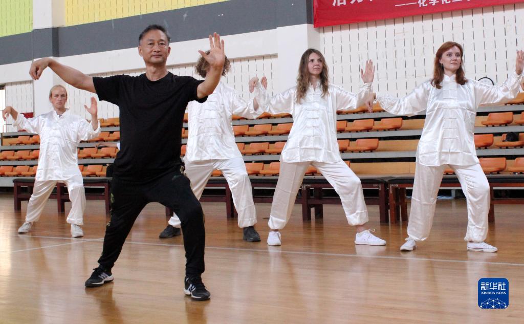 天津理工大學(xué)體育教學(xué)部教師為夏令營(yíng)學(xué)生講授太極拳課程(7月25日攝)。