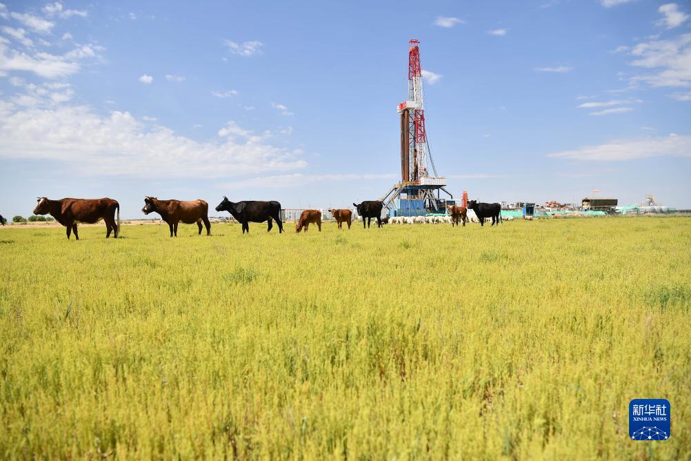 中國石油長(cháng)慶油田蘇里格氣田第三采氣廠(chǎng)一處鉆井平臺旁,牛羊悠閑地吃草(7月24日攝)。