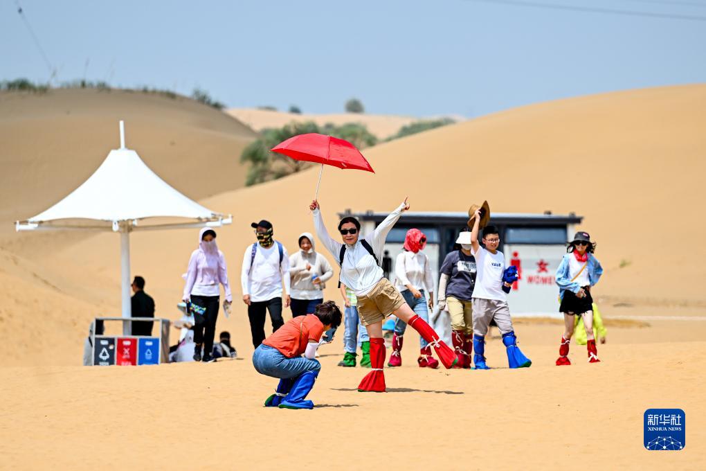 盛夏時(shí)節,內蒙古鄂爾多斯市達拉特旗境內的庫布其沙漠游客絡(luò )繹不絕,沙漠旅游一派火熱。游客們在飽覽大漠美景的同時(shí),也體驗騎駱駝、滑沙等項目的獨特魅力。