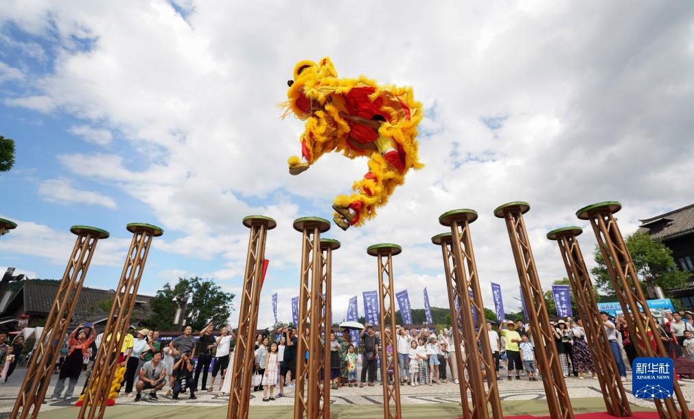 7月21日,游客在貴州省黔東南苗族侗族自治州丹寨縣萬(wàn)達小鎮觀(guān)賞“南海醒獅”表演。