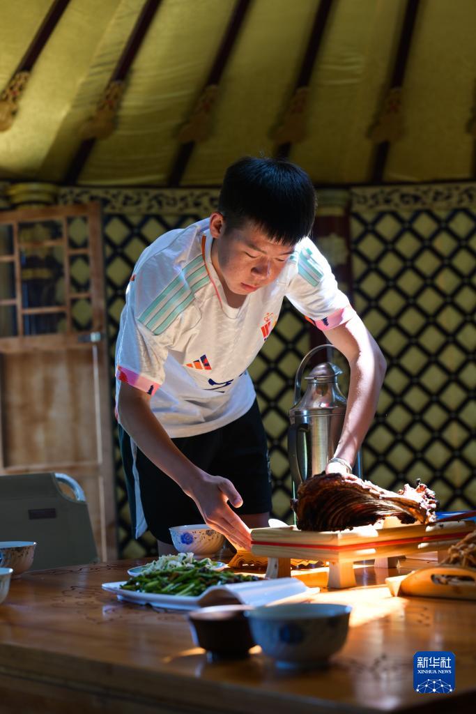 7月24日,吳蘇日力格為游客上菜。