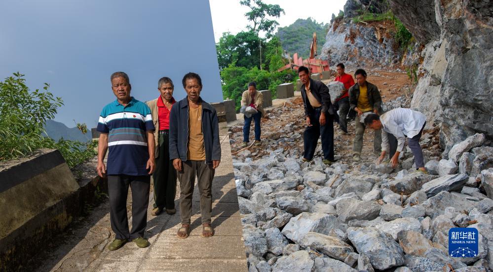 這是一張拼版照片:右圖為2013年李華明(左一)和巖頭村村民楊運富(中)、李光才(右二)一起修路的資料照片(西疇縣融媒體中心供圖,陳明凱攝);左圖為2023年7月26日李華明(左)、楊運富(中)和李光才一起在他們修好的出村路上合影(新華社記者費茂華攝)。新華社發(fā)