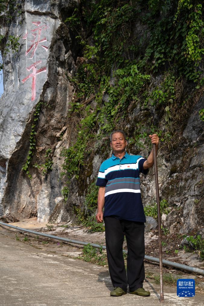 李華明站在自己和村民一起修好的從巖頭村通往外面的公路上(7月26日攝)。新華社記者 費茂華 攝