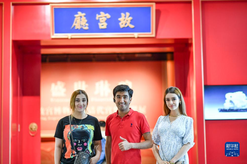 三名塔吉克斯坦舞蹈演員在新疆博物館“故宮廳”前合影(7月29日攝)。