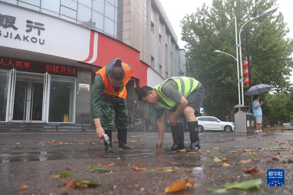 7月30日,在河北省石家莊晉州市城區,防汛工作人員在清理下水道入口。