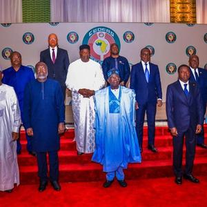 7月30日,在尼日利亞首都阿布賈,參加西非國家經(jīng)濟共同體(西共體)緊急會(huì )議的西非國家領(lǐng)導人合影。