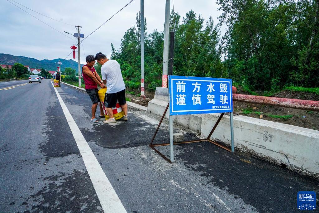 7月31日,工作人員在河北省遵化市羅文峪村南側設置車(chē)輛通行提示標志。