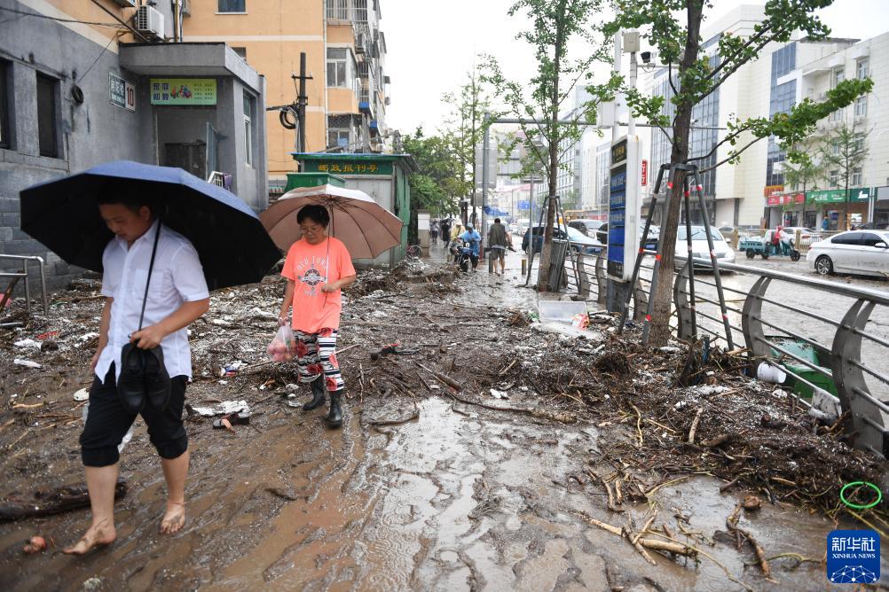 7月31日,在北京市門(mén)頭溝區雙峪路,行人從淤泥和雜物上走過(guò)。