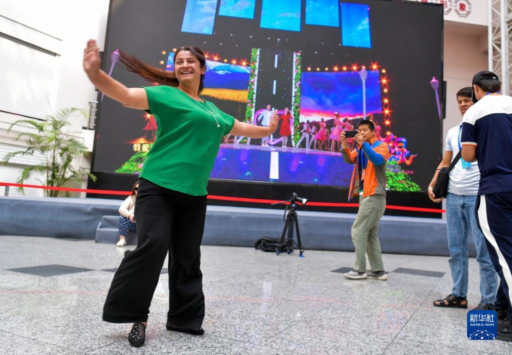 7月31日,在新疆藝術(shù)劇院,塔吉克斯坦羅拉國家功勛歌舞團演職人員在交流活動(dòng)現場(chǎng)隨音樂(lè )起舞。