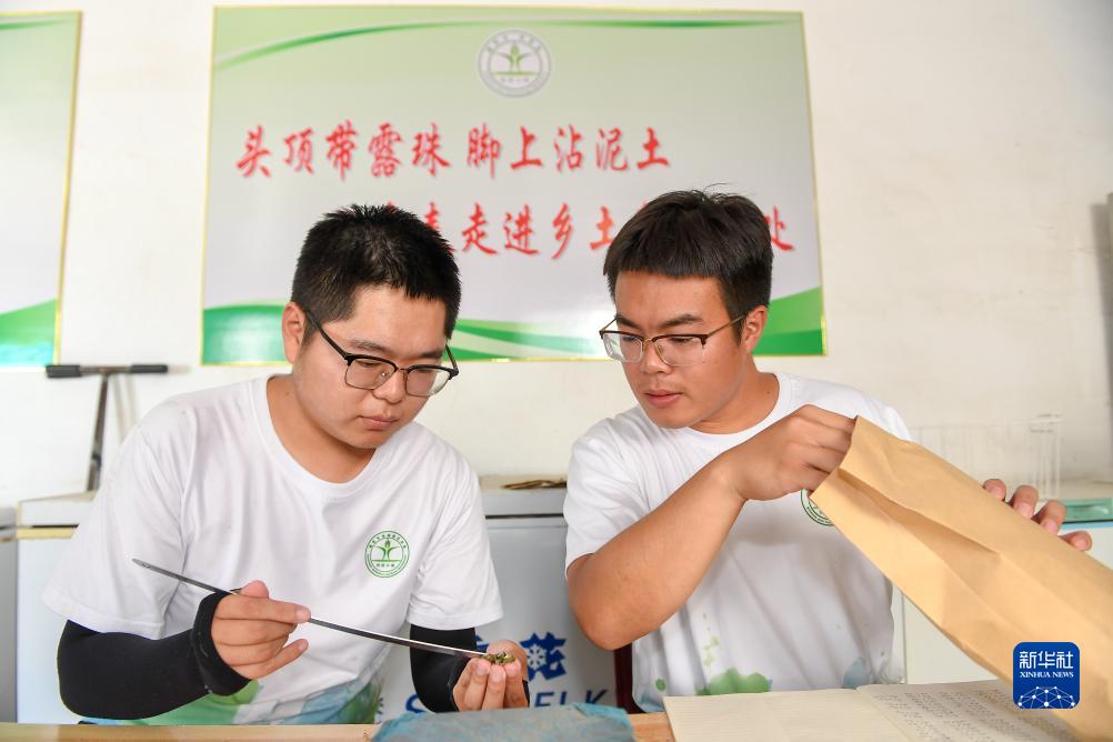 7月31日,在位于吉林省四平市梨樹(shù)縣的中國農業(yè)大學(xué)“科技小院”,在讀博士生沙野(右)和在讀碩士生蔣家偉在測量保護性耕作玉米樣本數據。
