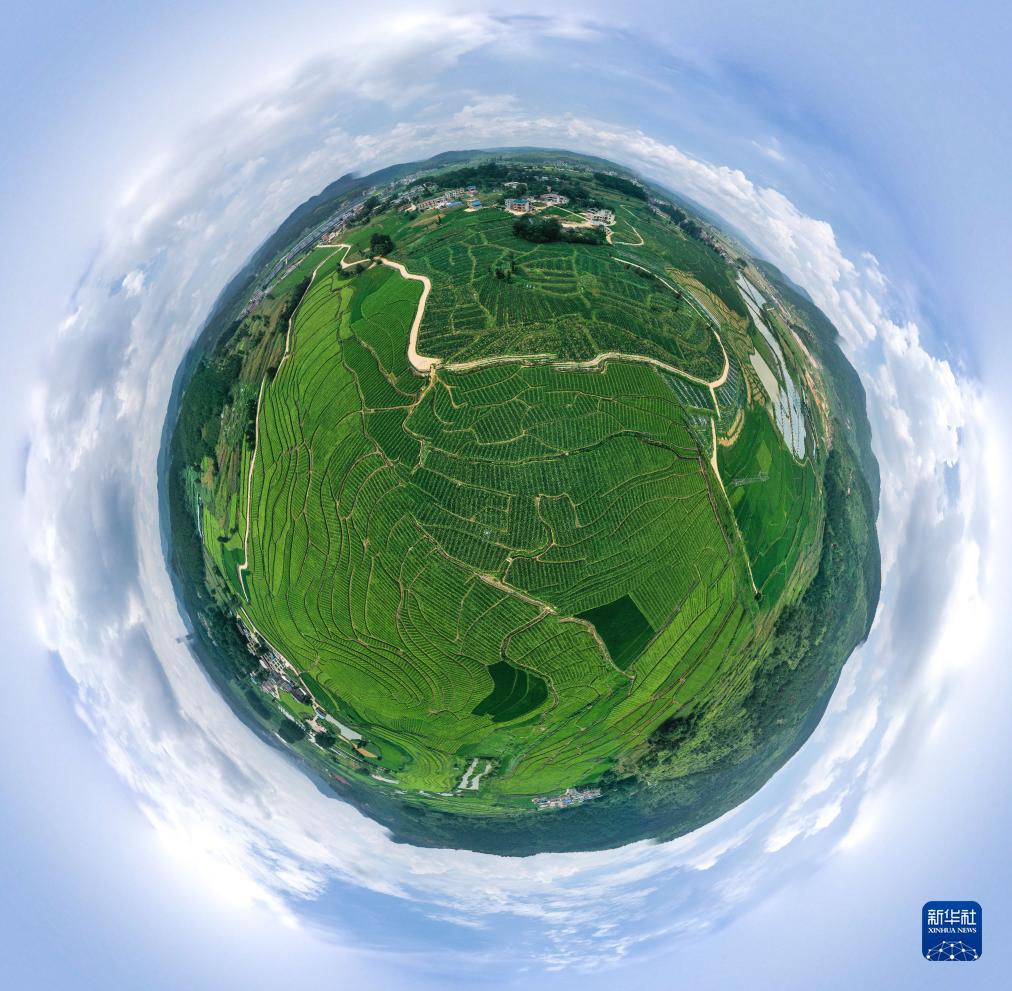 這是8月1日拍攝的貴州省岑鞏縣水尾鎮新場(chǎng)村雜交水稻制種基地(無(wú)人機全景照片)。