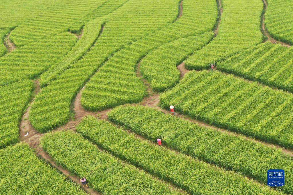 8月1日,農民在貴州省岑鞏縣水尾鎮新場(chǎng)村雜交水稻制種基地進(jìn)行人工“趕花”授粉(無(wú)人機照片)。