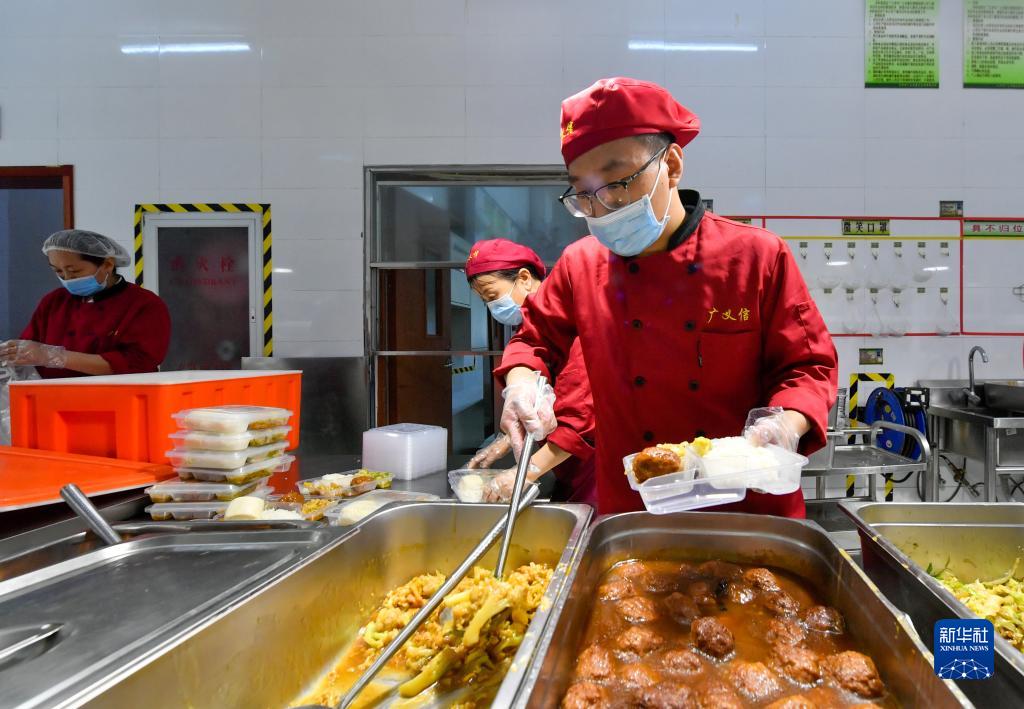 8月1日,在天津市武清區職業(yè)教育中心臨時(shí)安置點(diǎn),工作人員為轉移人員準備午飯。
