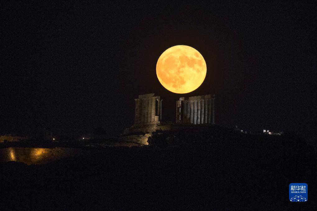 8月1日晚,一輪滿(mǎn)月在希臘雅典附近蘇尼翁角的波塞冬海神廟上空升起。