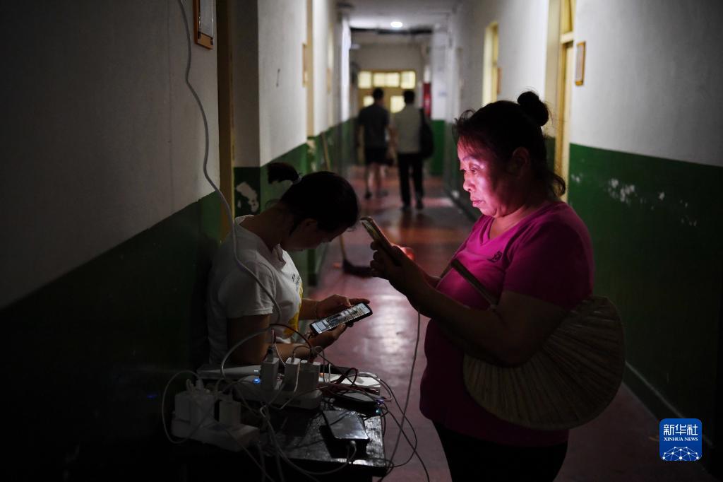 8月1日,安置群眾在河北省涿州市職教中心安置點(diǎn)內給手機充電。