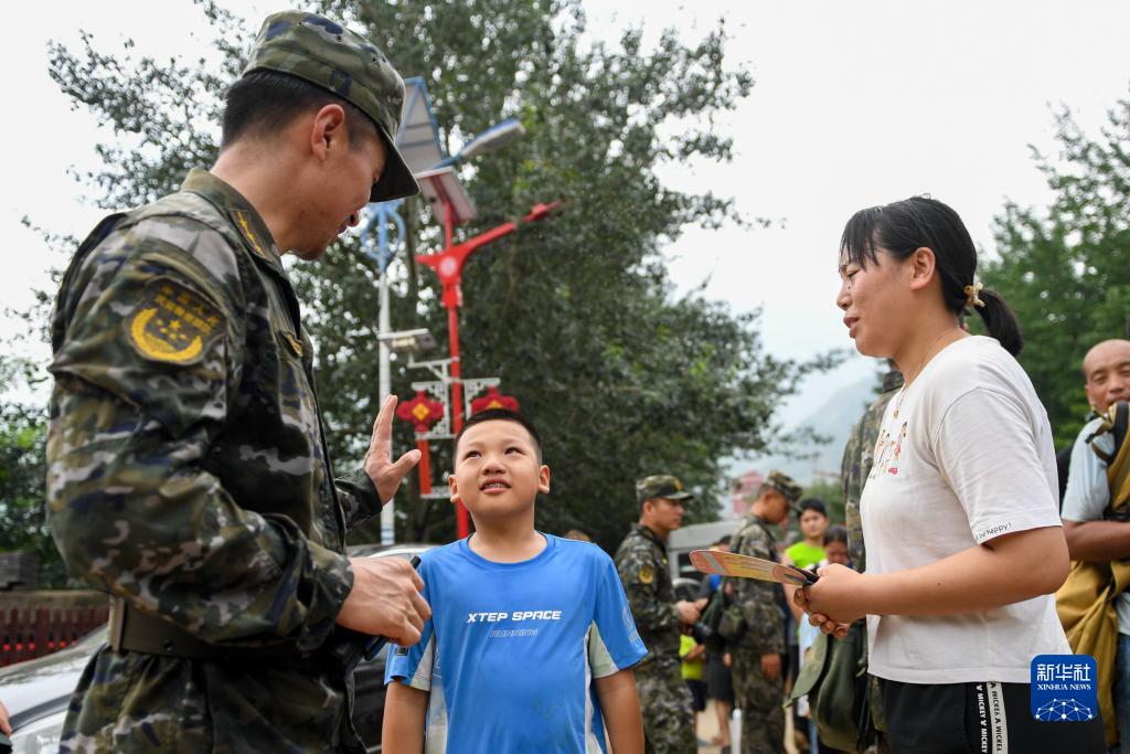 8月2日,在北京市門(mén)頭溝區妙峰山鎮,在乘坐車(chē)輛轉移前,武天騏(中)與武警北京總隊機動(dòng)三支隊的王雷鳴道別。