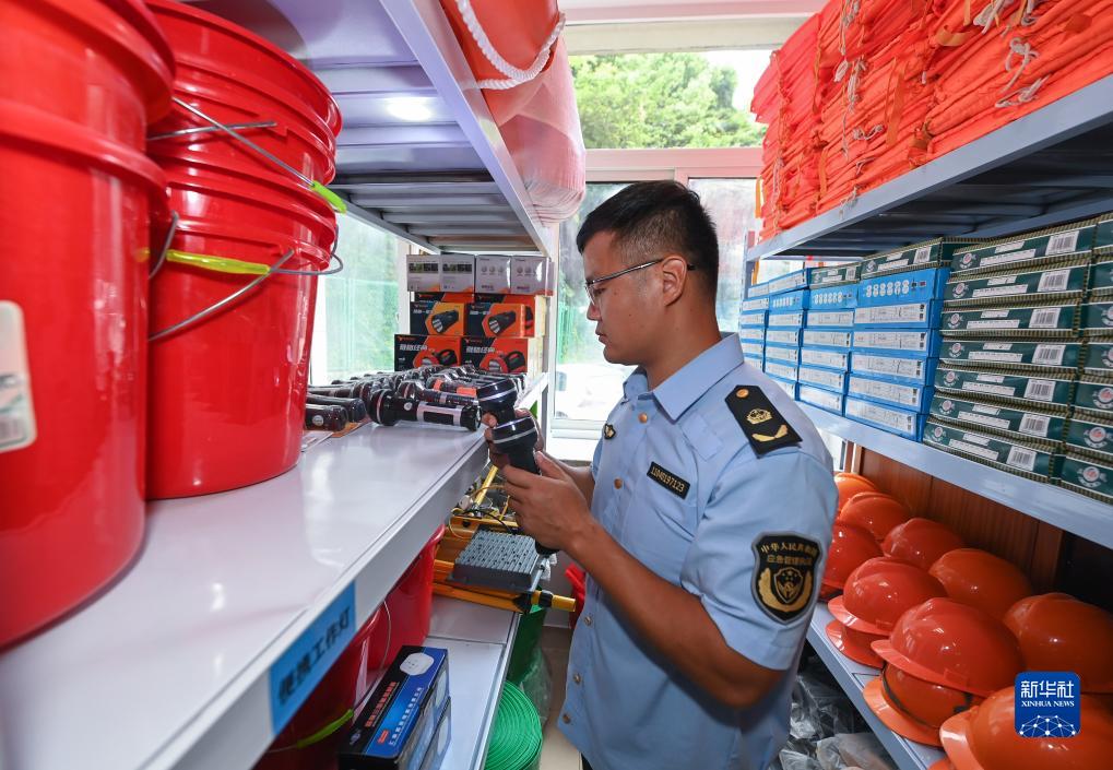8月2日,浙江省湖州市吳興區道場(chǎng)鄉應急管理服務(wù)中心工作人員在庫房清點(diǎn)防汛物資。