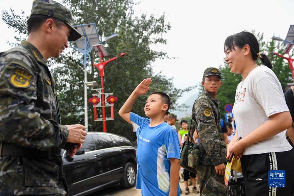 8月2日,在北京市門(mén)頭溝區妙峰山鎮,在乘坐車(chē)輛轉移前,武天騏(中)向武警北京總隊機動(dòng)三支隊的王雷鳴敬禮感謝。