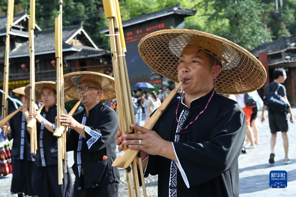 8月1日,苗族群眾在貴州省黔東南苗族侗族自治州雷山縣西江千戶(hù)苗寨景區吹奏蘆笙迎客。