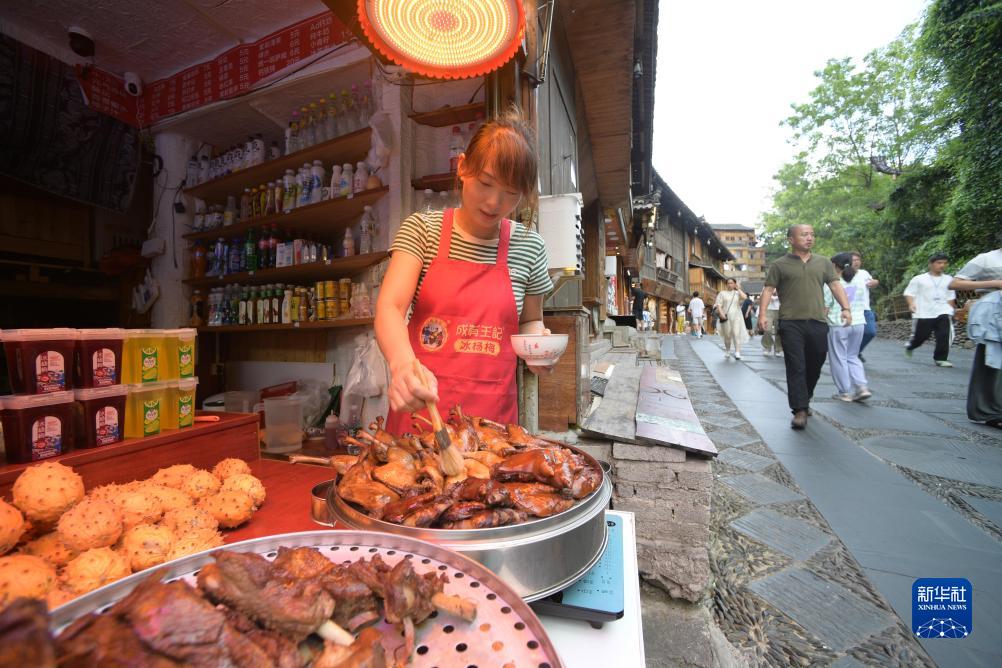 8月1日,一名店主在貴州省黔東南苗族侗族自治州雷山縣西江千戶(hù)苗寨景區準備食品。