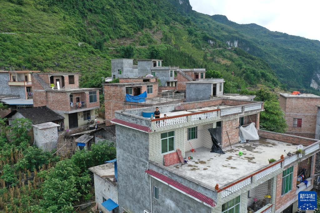 7月31日,吳世榮和女兒在百色市那坡縣百南鄉甲柳村上保屯的自家房頂上(無(wú)人機照片)。新華社記者楊植森攝