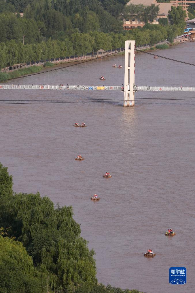 8月2日,游客在寧夏中衛市沙坡頭景區體驗羊皮筏子漂流。