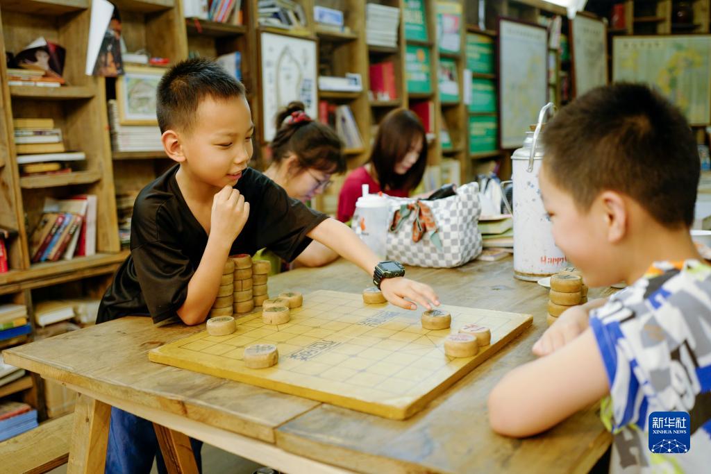 8月2日,兩個(gè)男孩在重慶市九龍坡區黃桷坪街道的一家書(shū)屋下棋。