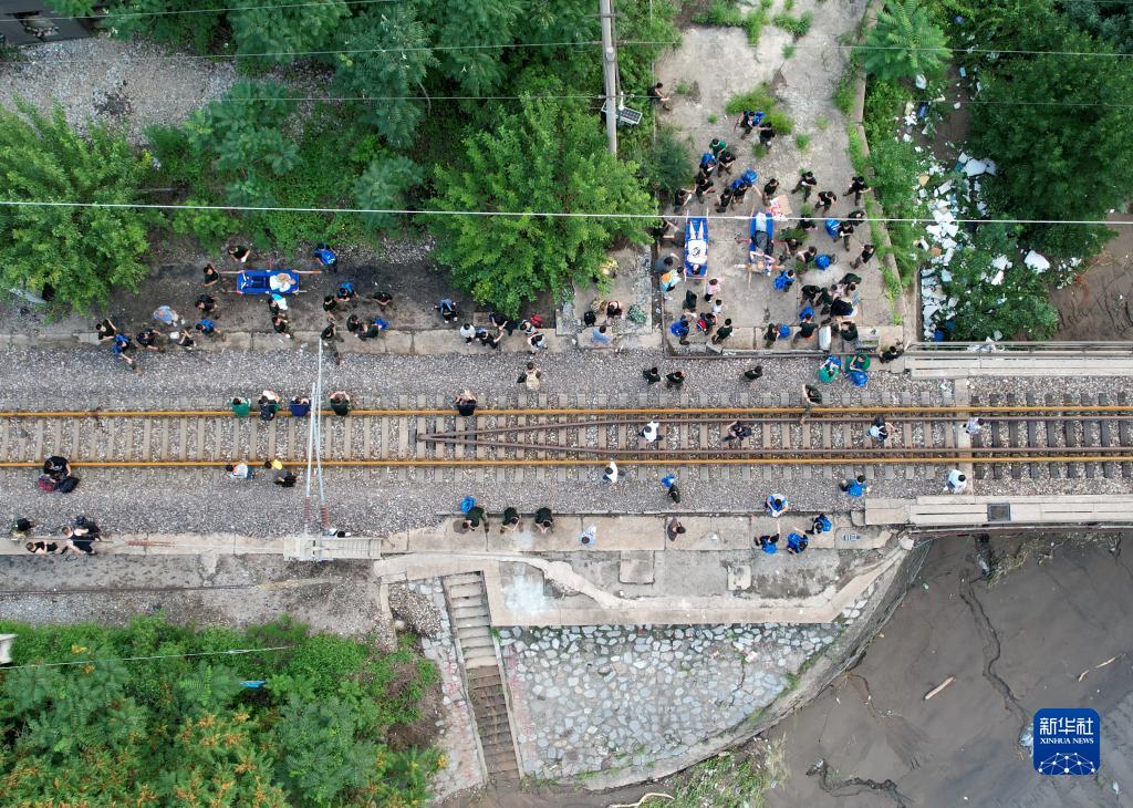 8月2日,受困列車(chē)旅客在救援人員幫助下徒步趕往轉運客車(chē)(無(wú)人機照片)。
